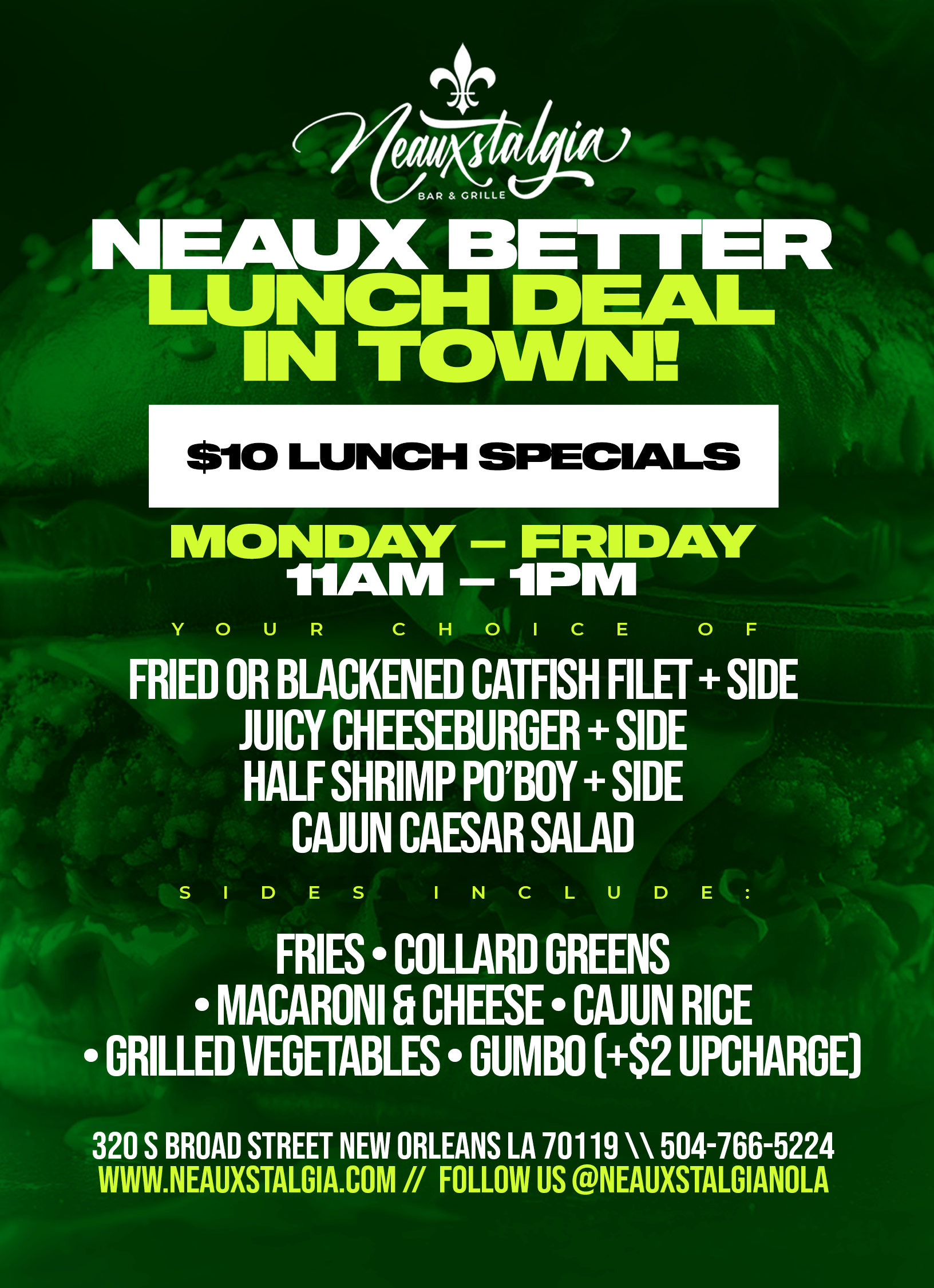 Serve with your choice of side and two hush puppies NO SIDE FRIES $7, GRILLED VEGGIES, MAC AND CHEESE , CAJUN RICE, SAUTEED GREENS